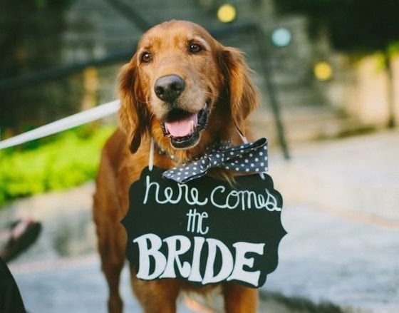 Whether your fur baby is posing for pics, playing the role of ring bearer or flower girl or just attending as an honored guest, you might as well deck him or her out in one of the ridiculously cute wedding signs below: